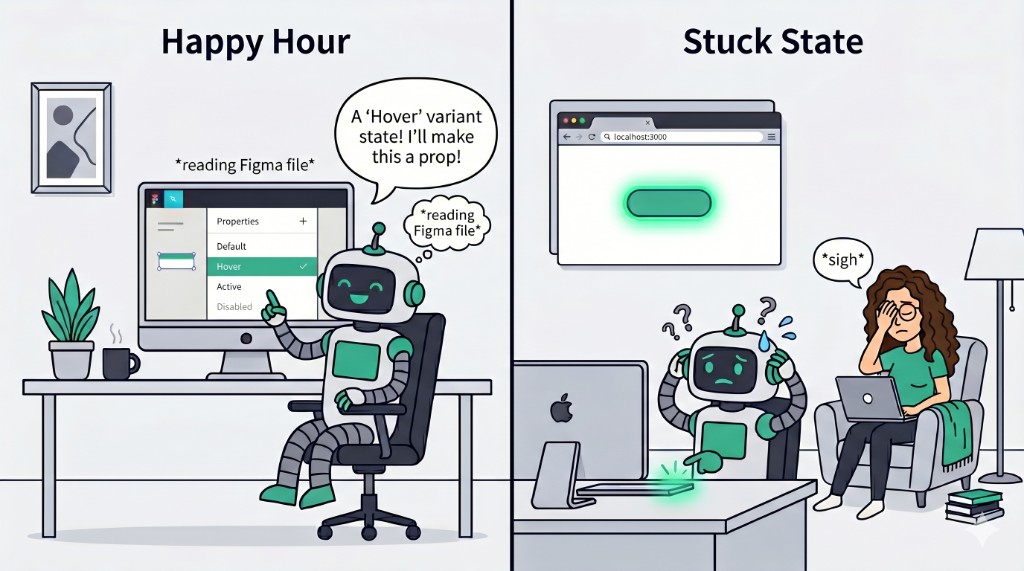 This is a translation problem, not an AI problem. The same information means different things in different contexts. In Figma, "Hover" is a visual specification. In code, "hover" is a CSS pseudo-class. The AI does not know the difference because, as far as it can see, the design file is the source of truth.